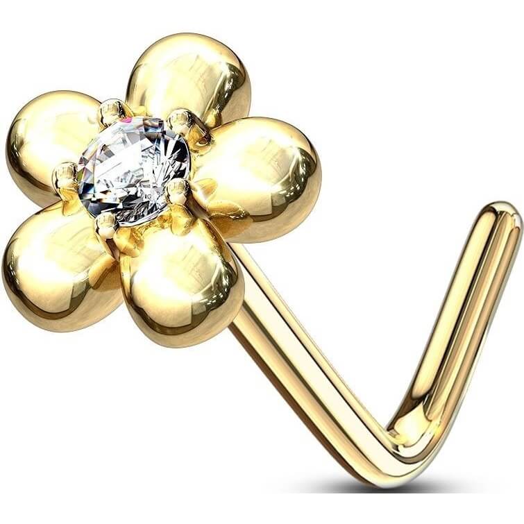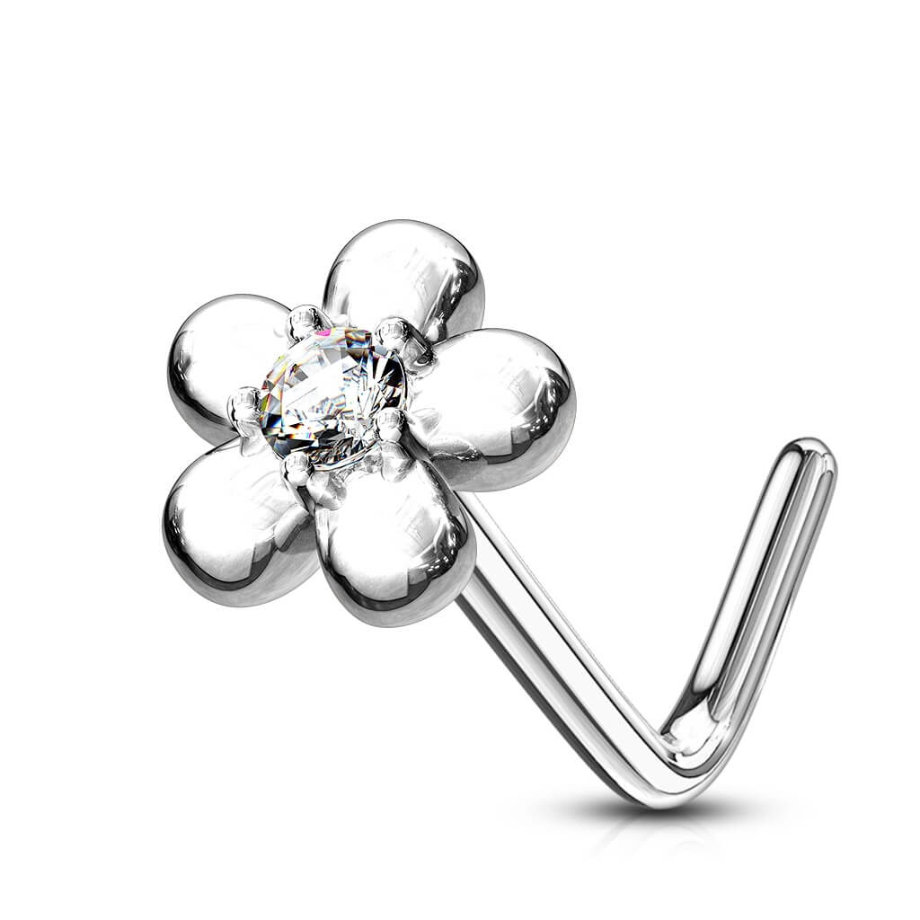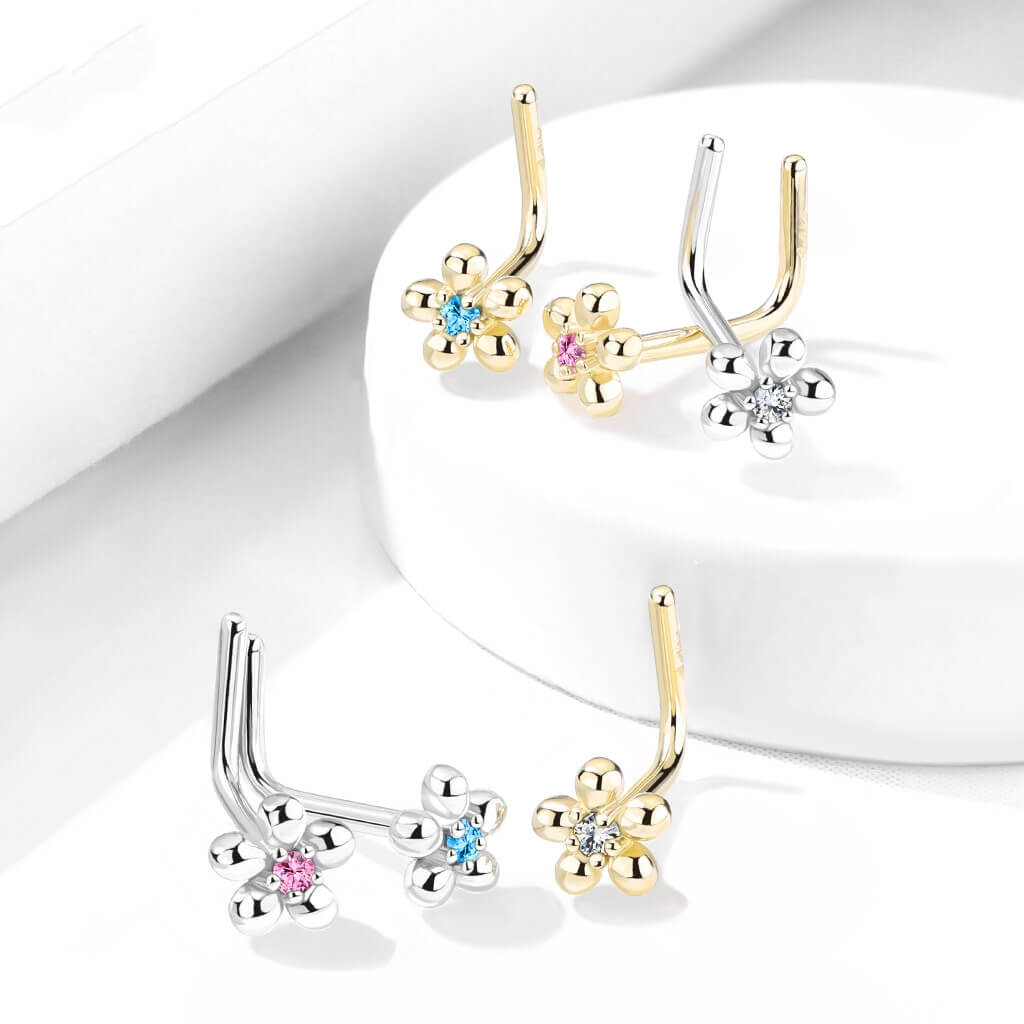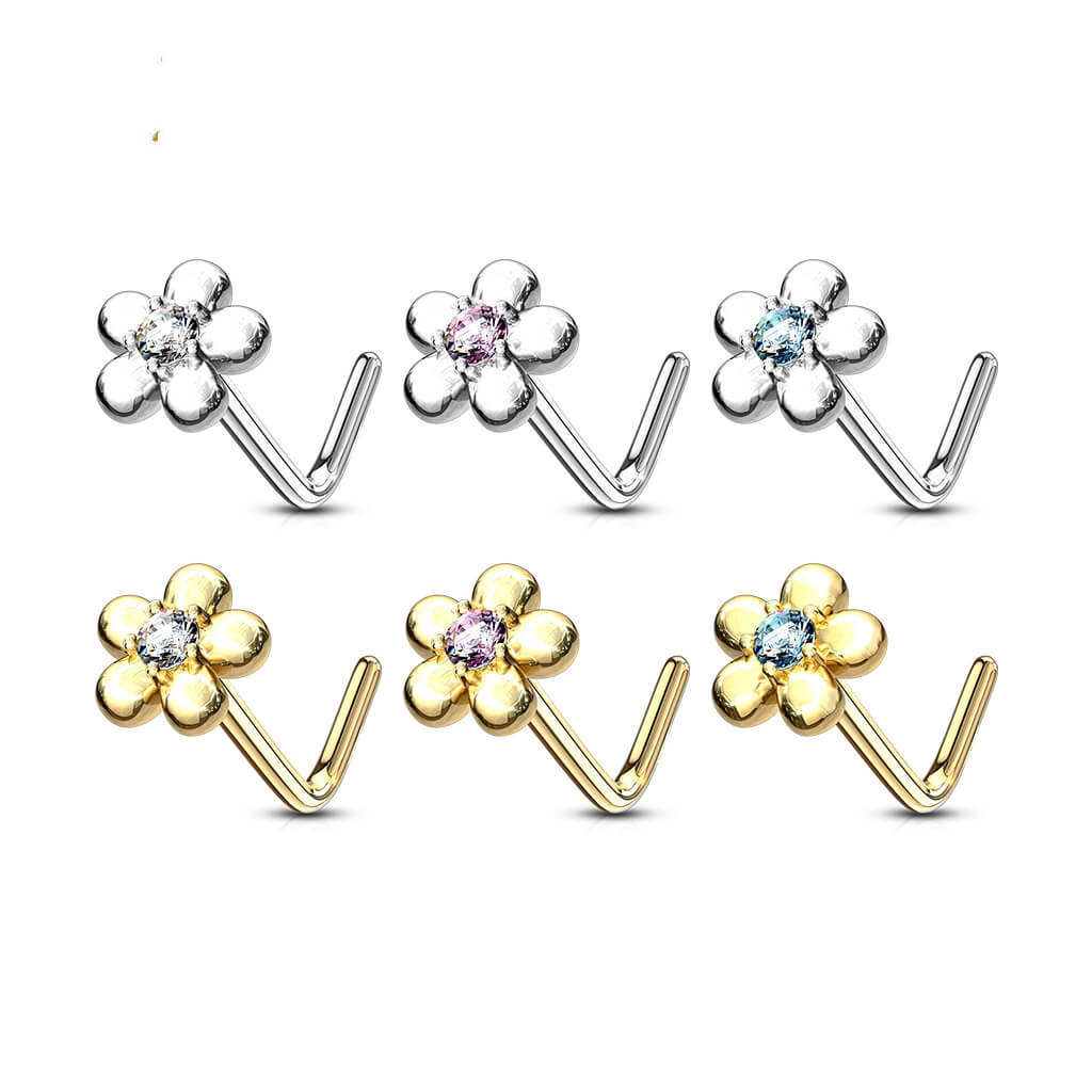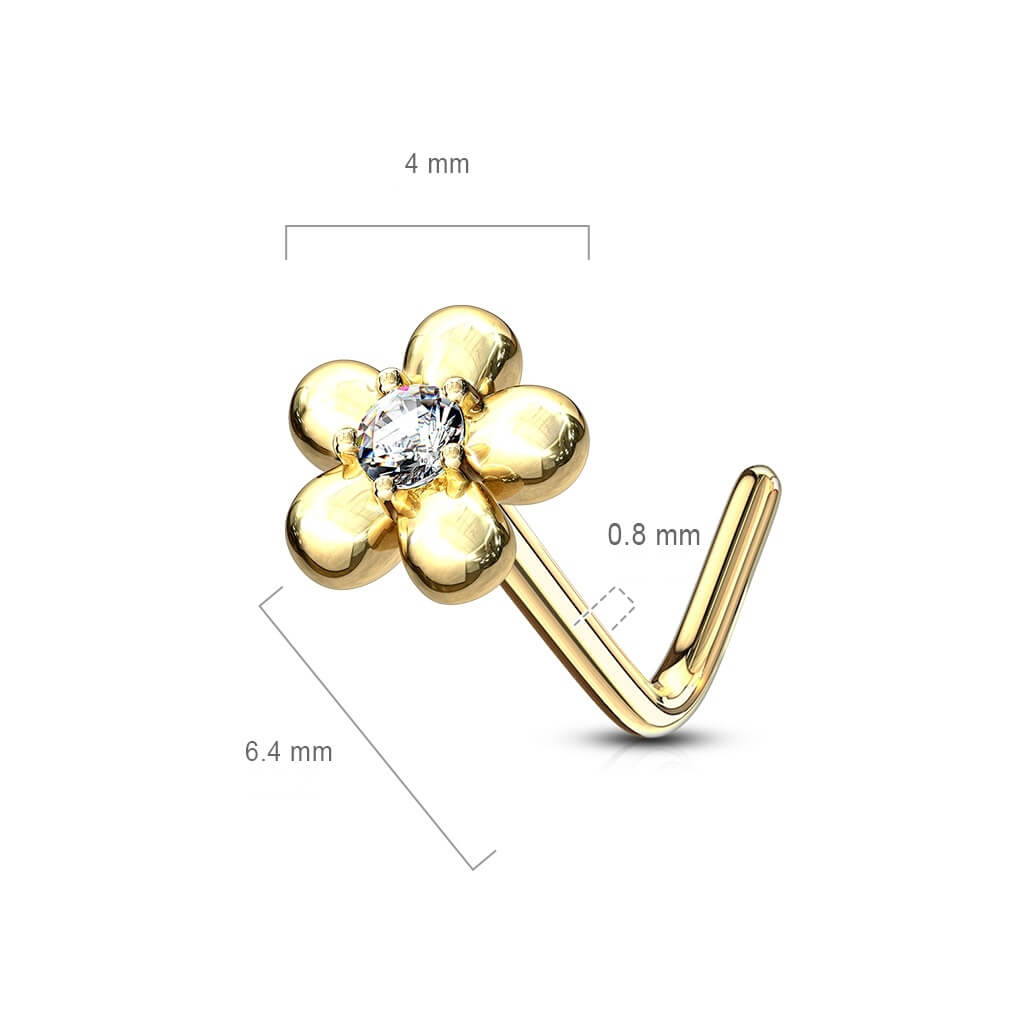 Solid Gold 14 Carat Nose L-Shape Flower Zirconia